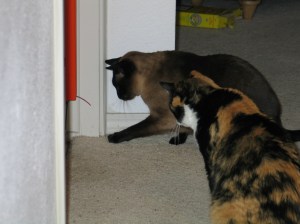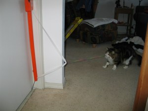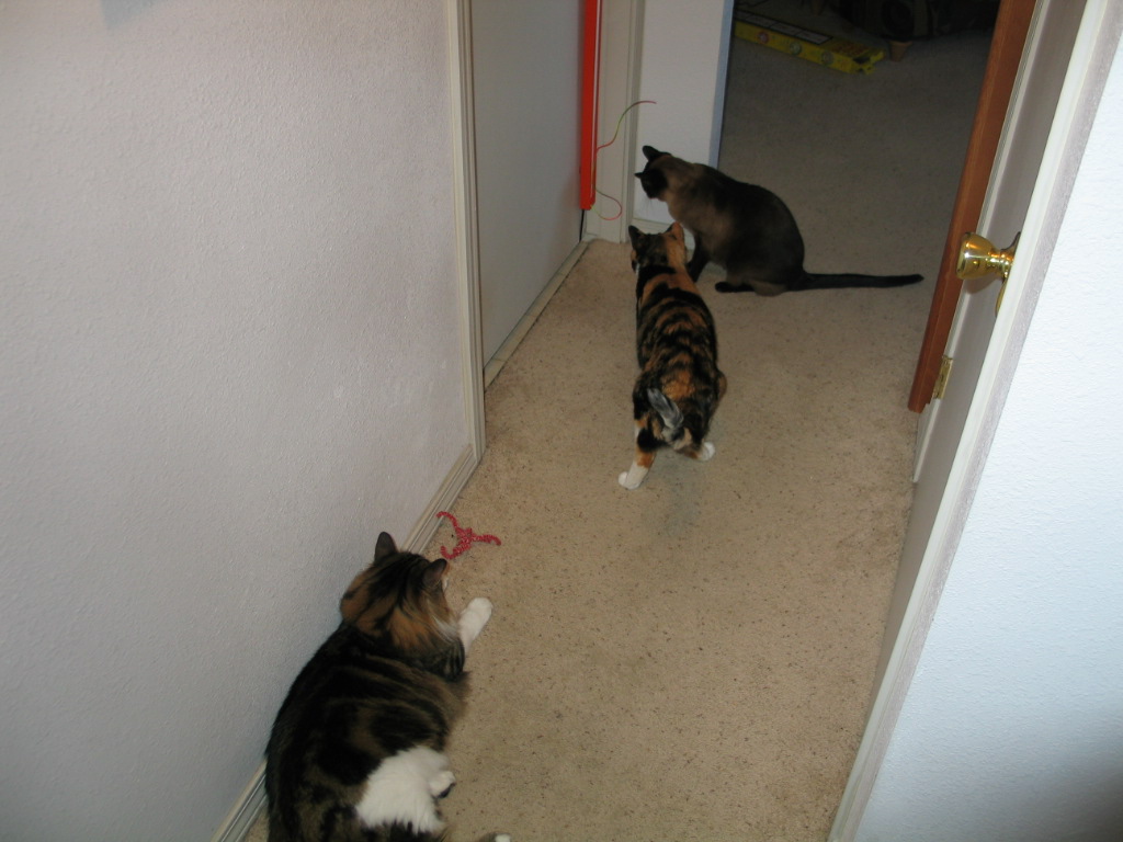 And because SOMEONE says “more cat pictures.”. . . These pictures are from 2008, when we still had Simon and Misty (both deceased now) but we had Leo too. We had a new toy, that attaches to the door and runs on batteries. We don’t get this out too often but it does keep them busy for a while when we do get it out. MaryAnne will play with it, Leo will watch it like a TV.