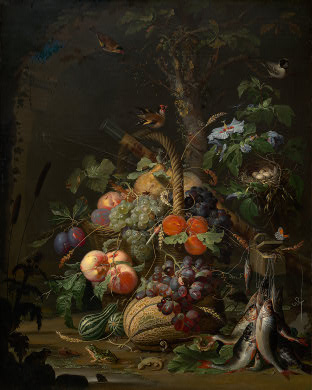 Painting that made me the happiest: Still Life with Fruit, Fish, and a Nest, by Abraham Mignon c. 1675, because I mis-read it the first time and thought it said Still Life with Fruit, Fish and a Newt, and I was pretty excited about the amphibian content. Unfortunately, the painting does not have an actual newt. It does, however, have a lizard. Dead.The lizard is right in front of the cantelope, if you are looking for it.