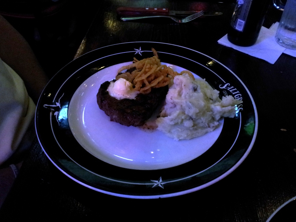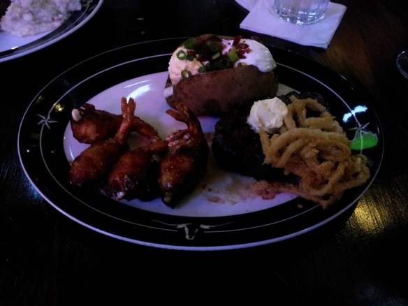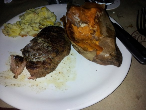 Here are some pics from Ted’s Montana Grill that I couldn’t access when I posted about it. It is making me hungry looking at them right now. Beef filet with baked sweet potato and summer squash casserole.