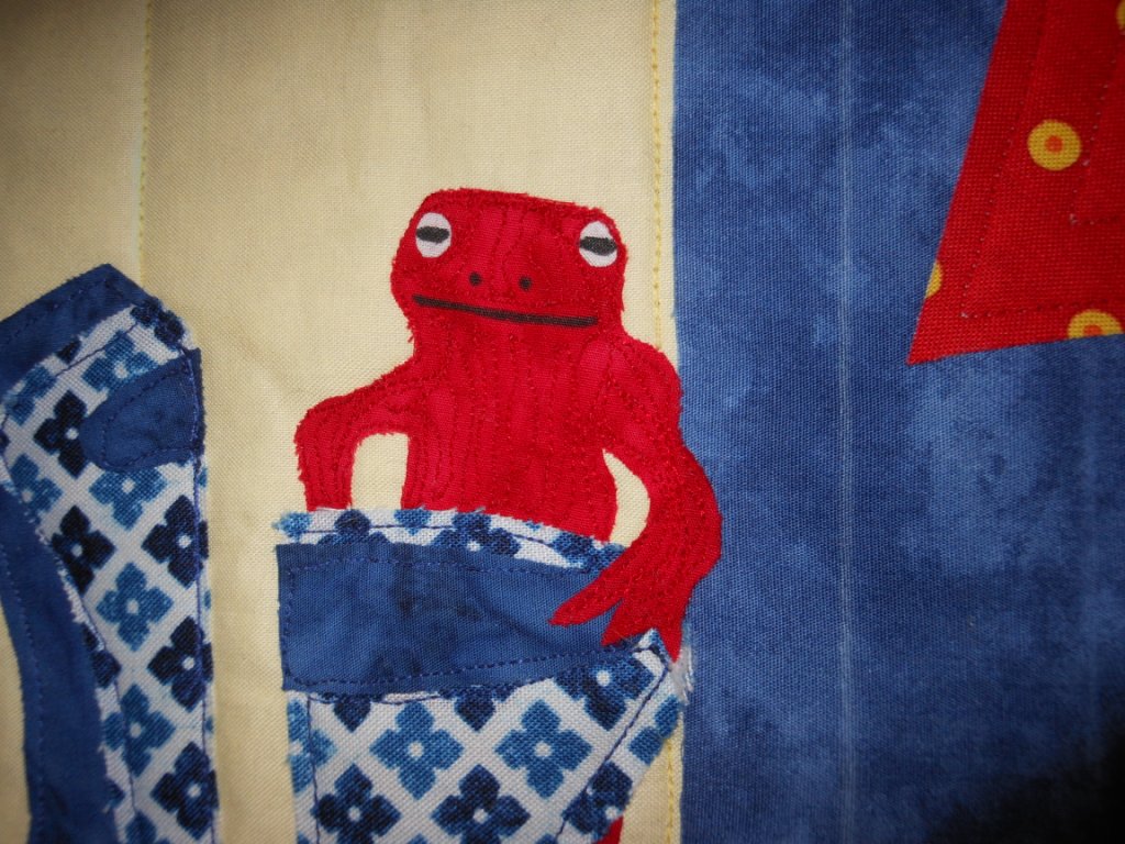 Progress has been made on the Newt quilt. Saturday I got it all fused together and started quilting it. I am done with the majority of the quilting, I didn’t want to make it too visible because the quilt already has so much going on. But I do think I need to do a little more in the background/wall. Make a little bit of a pattern back there so it isn’t too flat.
