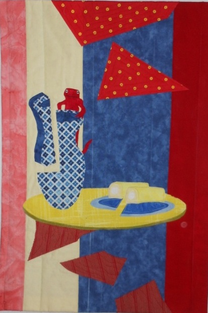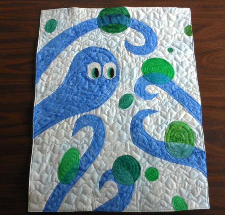 I finished the Octopus and Bubbles quilt for my Color Theory class. This quilt was supposed to use color to show transparency – so you are supposed to be able to see the octopus’ tentacles through the bubbles, and that is done but using a color that combines the color of the octopus and the bubble. It is not a terribly complex quilt but it was fun.