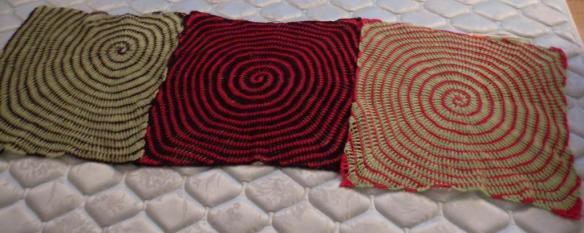 This pattern is called “Vortex” and I should have gone down one or two sizes of crochet hook, because it is blocking out quite large. I will turn it into a square blanket when I get some more green yarn.