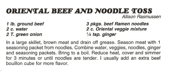 sewed a little on my color class project (taking a quilting class based all on color theory), sorted clothes for DH to wash, looked out at the snow and complained, and did some family phone calling that needed to be done. Made beefy harvest soup for me for lunch http://www.txbeef.org/recipe_book/soups_stews_and_chilis/beefy_harvest_soup and Oriental Beef and Noodle Toss for DH (a recipe which he inexplicably likes, I sometimes hit on the oddest things that he actually enjoys. Unfortunately, I do not enjoy it much (not spicy enough)).(Recipe I have scanned in from a cookbook and saved to the computer in an effort to narrow down the cookbook collection.)