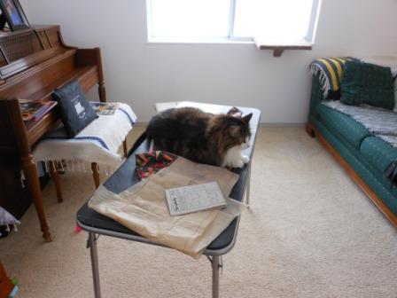 I needed to go out to the store to get additional potatoes and some other things for Thanksgiving Part II, but I wasn’t about to go out until the snow settled down a bit. So I worked on cutting out pants for DN 12 (birthday pants about 2 months late) (with the help of the cats, of course),