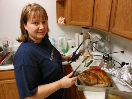 The adventurous part of the turkey was getting it from one pan into another so I could easily get the pan juices to make gravy. I have a baster, and could have retrieved the juices w/that, but it isn’t really that functional, I have had it forever, maybe there is a better design out there now……So I grabbed my nice new tongs from IKEA a few weeks ago, and my giant grilling tongs, and I manhandled that baby over. No disaster, surprisingly. The only treat the cats got was when I dropped the basting brush onto the (relatively clean, before that) floor and spattered butter and herbs everywhere.