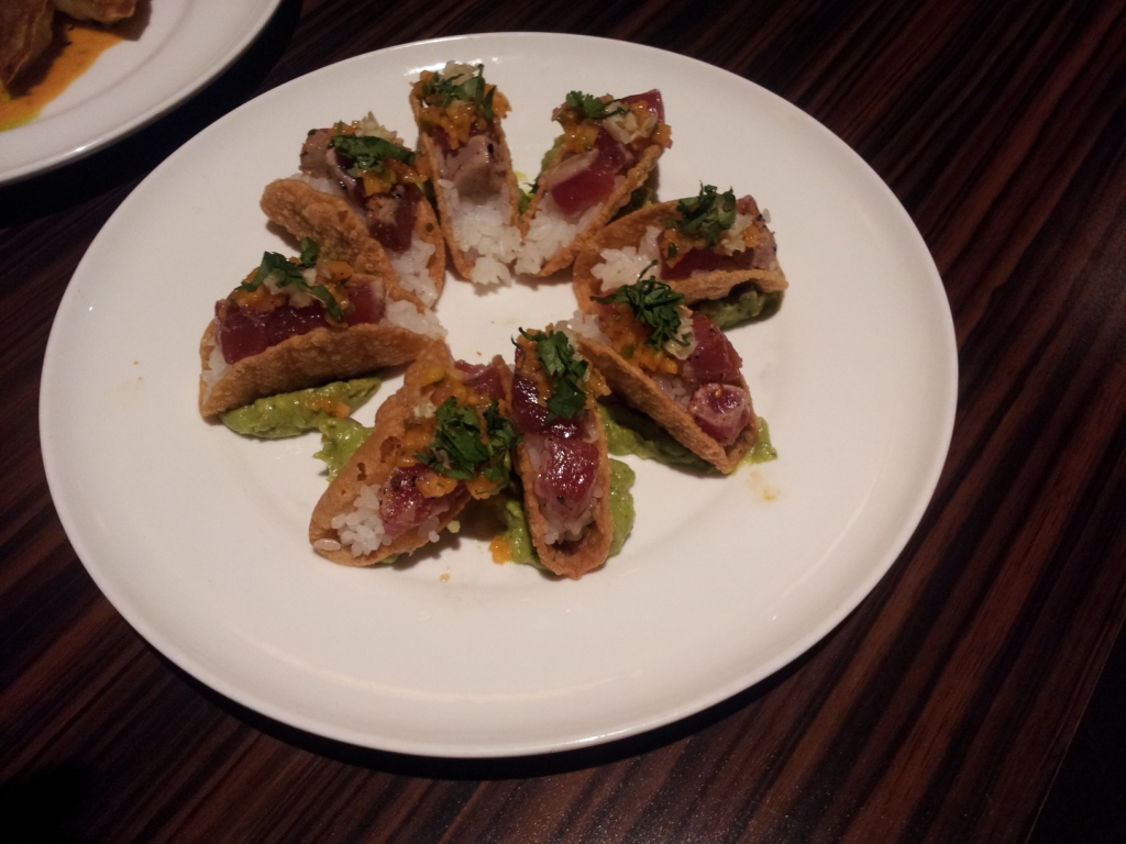 We had some of the TACO SUSHI / charred ahi, sushi rice, guacamole, li-hing mango salsa  – these were awesome. The 2nd best appetizer.