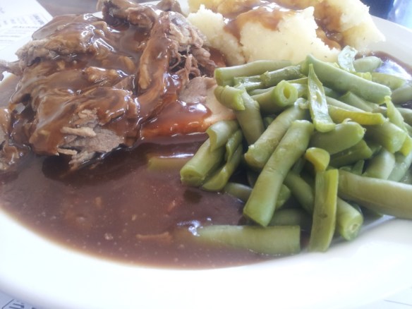 I had the hot turkey sandwich. Quite good. Not real mashed potatoes, but still good. And they don’t get carried away with the portion, you don’t need two scoops for lunch.