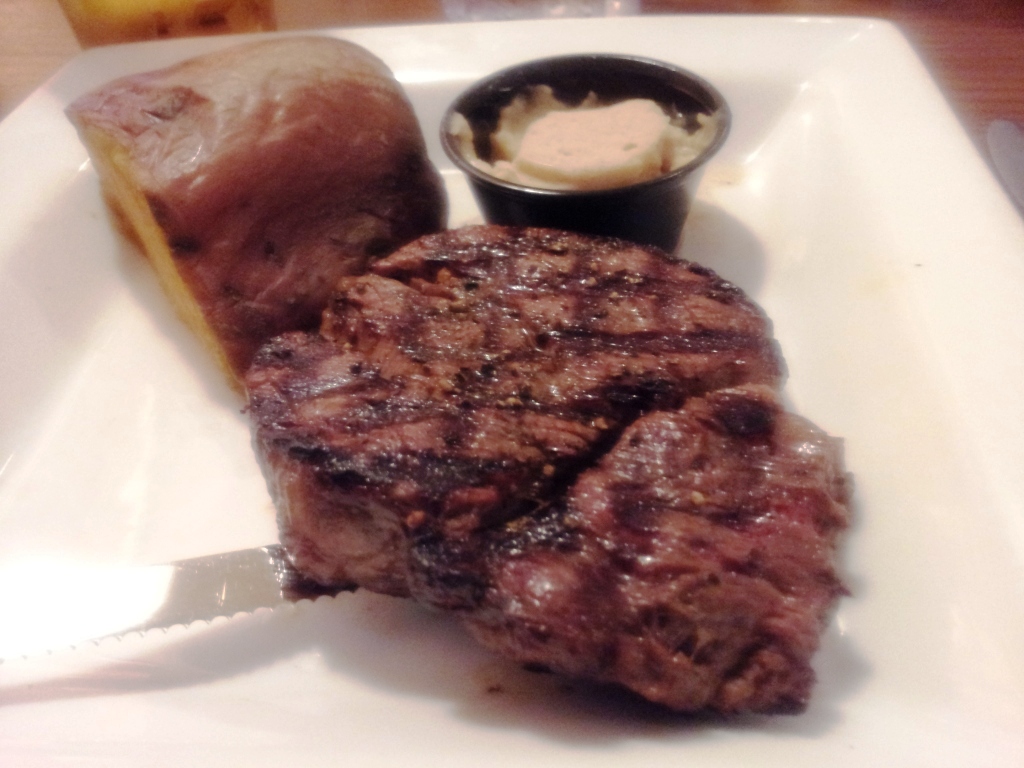 Kenny ordered the 8 oz sirloin and I got the sirloin steak sandwich, because I knew I would get the smallest piece of meat with that and I didn’t want a huge steak. We also ordered the chips and salsa. The chips were not real fresh but the salsa was good.