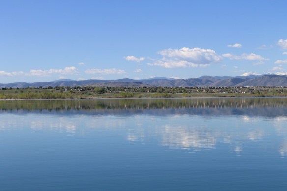 Got up Sunday morning and had waffles and bacon, and then took them for a scenery run. (Run in the car, not an actual on-foot run, oh that is SO funny.) We went up to Standley Lake, and wandered out onto the floating dock to take pictures. The lake was like glass that morning.