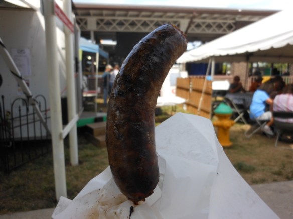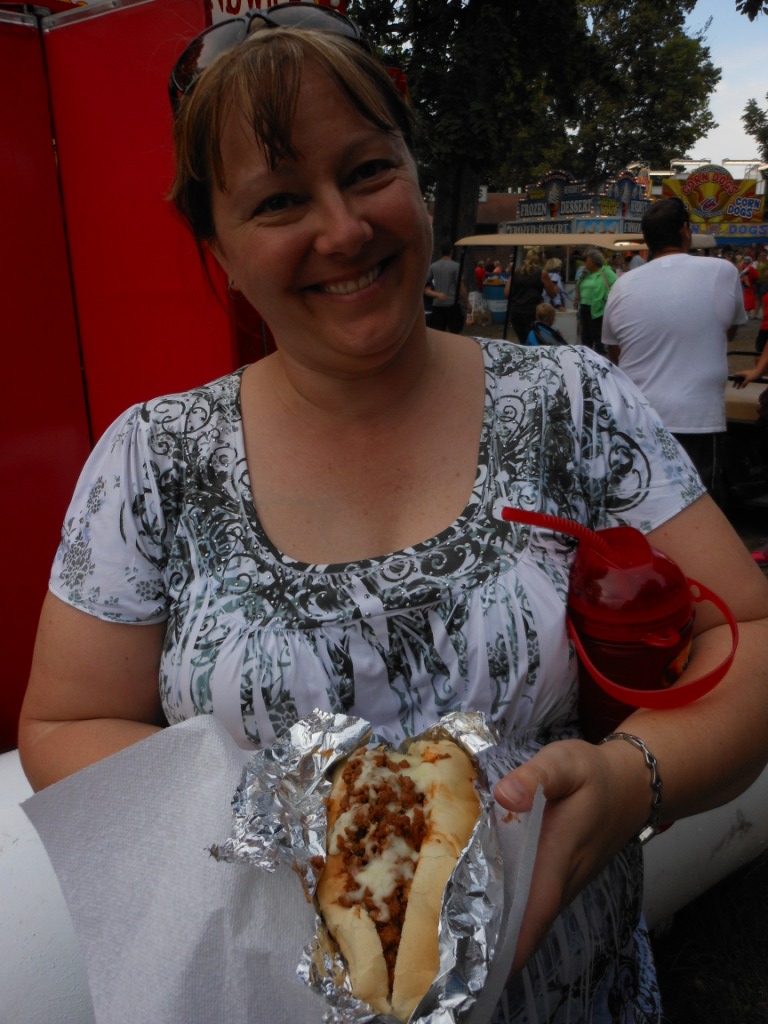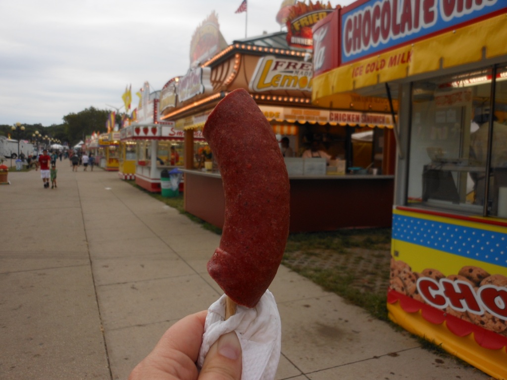 We headed out to the fair and got there about 9:00 – I started out the daily food fest with hot bologna on a stick from the Pella booth. (Side note – I can’t get ring bologna in Colorado. I can get smoked sausage and Polska Kielbasa in Colorado, but I can’t get the ring bologna that I grew up with in South Dakota.) (Not at grocery stores, at least – I guess I should start checking at butcher shops.)