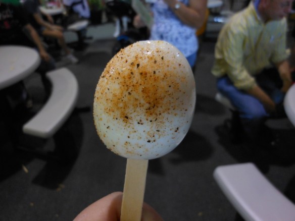 In the ag building, I looked at some of the crops and vegetable exhibits, and had an egg on a stick (free!) and an apple slush (excellent and refreshing).