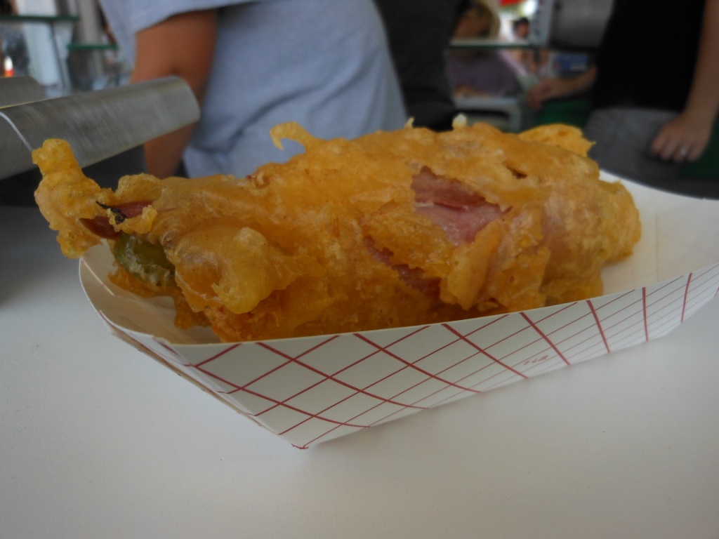 The kids looked at the butter cow and everything they wanted to cover in the Ag building, and then we headed out to the playground behind the Ag Building for the kids to run around. Shortly after we got there, a performance of a speed artist took place on the stage near there, and the kids watched that. I decided I was ready to try some more fried food (working my way through my list) and headed down the hill to the “Triangle’ where quite a few of the food booths were located, and headed for the “Pickle Dawg” booth. This is a pickle spear, rolled in cream cheese, with some jalapenos (optional) wrapped in in ham or pastrami, and then battered and fried. I, of course, chose the spicy option with jalapenos, and I chose the pastrami.