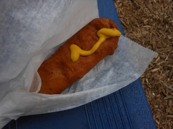 We got through the commercial building and headed up to the Double Bacon Corn dog booth, which was across the fairgrounds and up a hill, so at least you got some exercise going up there to get your corn dog. Wade and I each had one – they weren’t too bad for the first two bites, but then they really got to be a bit much, a little greasy at the end. And once again, I was feeling like I had quite enough fried food for a while. Worth having once but I don’t think I need to have one again.