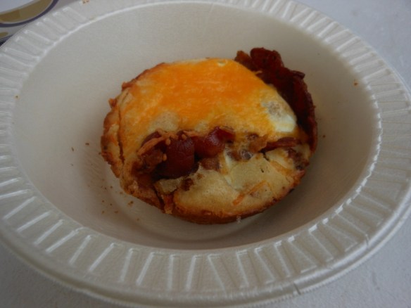 We were close to the cultural building where they had the photography, sculpture, woodworking, etc., so we went in there and looked at the photos and paintings for a while. They also had artists with items for sale, and I found some prints I liked and put on my list to come back and get later. By this time, we had heard from Laurie that she and the kids were there, so they came up the hill to find us. T. and D. needed some breakfast – T. had eggs, potatoes, and Texas toast, (and the potatoes had sausage and green peppers in them so Laurie and I ate most of them) and D. had macaroni and cheese – which was also good. I decided to try the bacon-wrapped eggs, which was kind of like a muffin with a whole egg in the middle of it and bacon on the outside – it was not bad. Oh, and cheese on top. And possibly there were potatoes in there. Breakfast in a muffin! Another new thing for the fair this year.