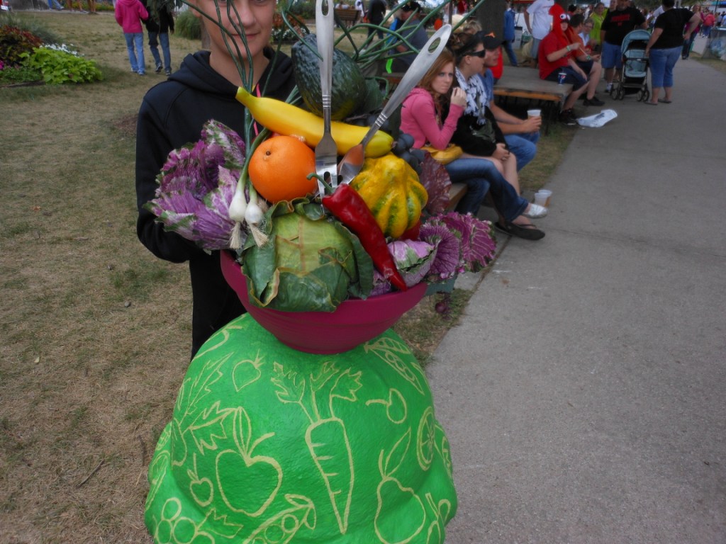 These are a few of the many painted concrete ice cream cones which were displayed around the fairgrounds, decorated by different groups or artists. This one was the cutest one, I think. We also liked the one with the vegetables on top. We hadn’t had a chance to look at the giant pumpkins yet, so we did that. They were smaller than usual this year, because of the drought.