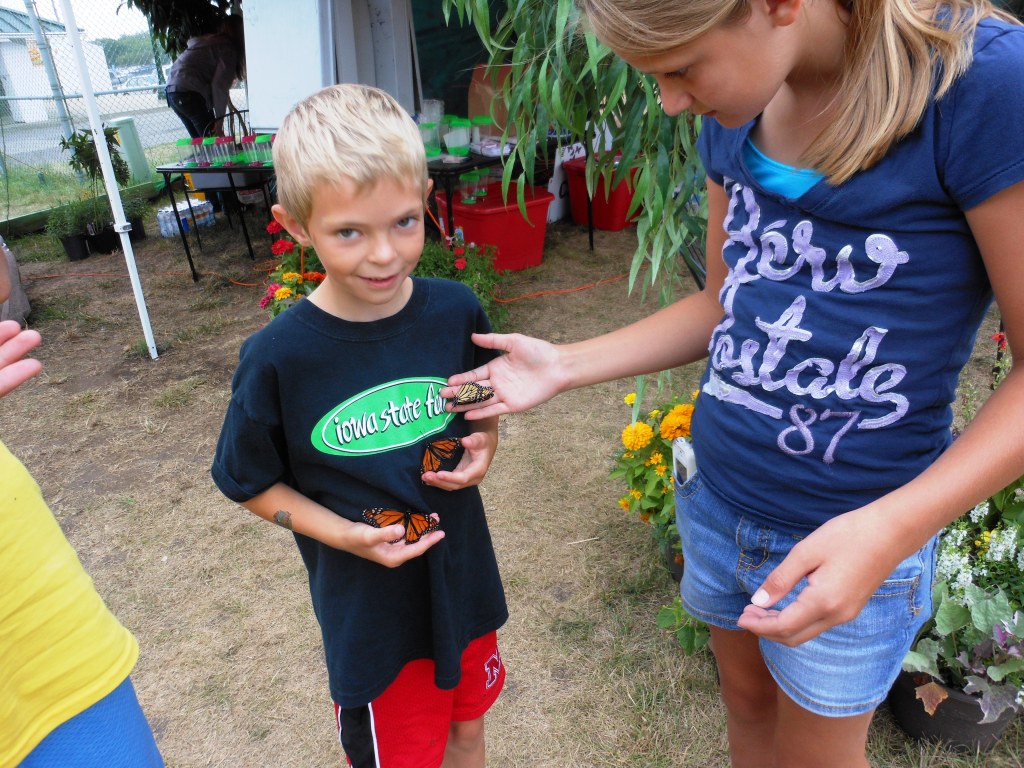 We were getting ready to head out, and the kids were given the option to do one more thing before T. would go with her Mom and the rest of us would head home. They wanted to go in the butterfly tent. This is an enclosed “butterfly adventure” but really it is a license to manhandle butterflies as much as you could want. The smart and/or lucky butterflies were up high on the tent where no kids could reach them, plus it was starting to really cool off, so they weren’t really flying around much. But there were still enough around for the kids to look at, pick up, fasten to their shirts, feed Gatorade on a q-tip, etc. And there were chairs, so I was in favor of that. I went in with the kids and Wade stayed outside and waited for Laurie to get there. When she arrived, we handed T. off to her and headed home. It rained on us driving home and we wondered if they were getting rain at the fairgrounds.