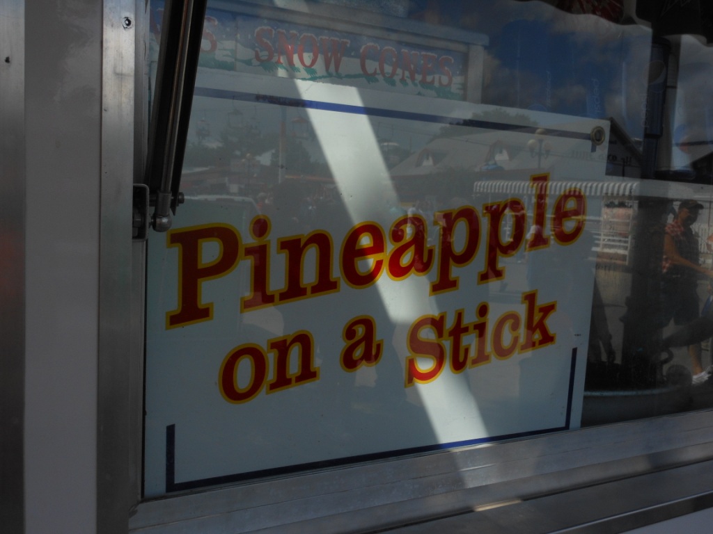 As I walked back across the fairgrounds, there was no line at one of the crazy fried foods booth. By now I realized my limitations on how much fried stuff I could eat in one day. So I tried to pick something unique that I hadn’t had before and wouldn’t ordinarily encounter. So I chose the deep-fried pineapple.  Wade declined to have a bite. This was really pretty tasty.