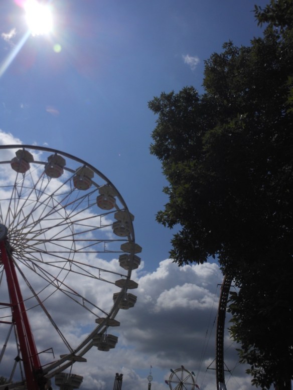 This was the day the kids were going to go on the midway rides, and I (crazy) was going to go with them. My brother was going to buy me the wristband. Well, somehow, he miscounted, and I didn’t get a wristband. Trust me, I was REAL torn up about this. And the kids found out their friend from the neighborhood was going, so they would have her to ride with. They are up there somewhere in this picture: