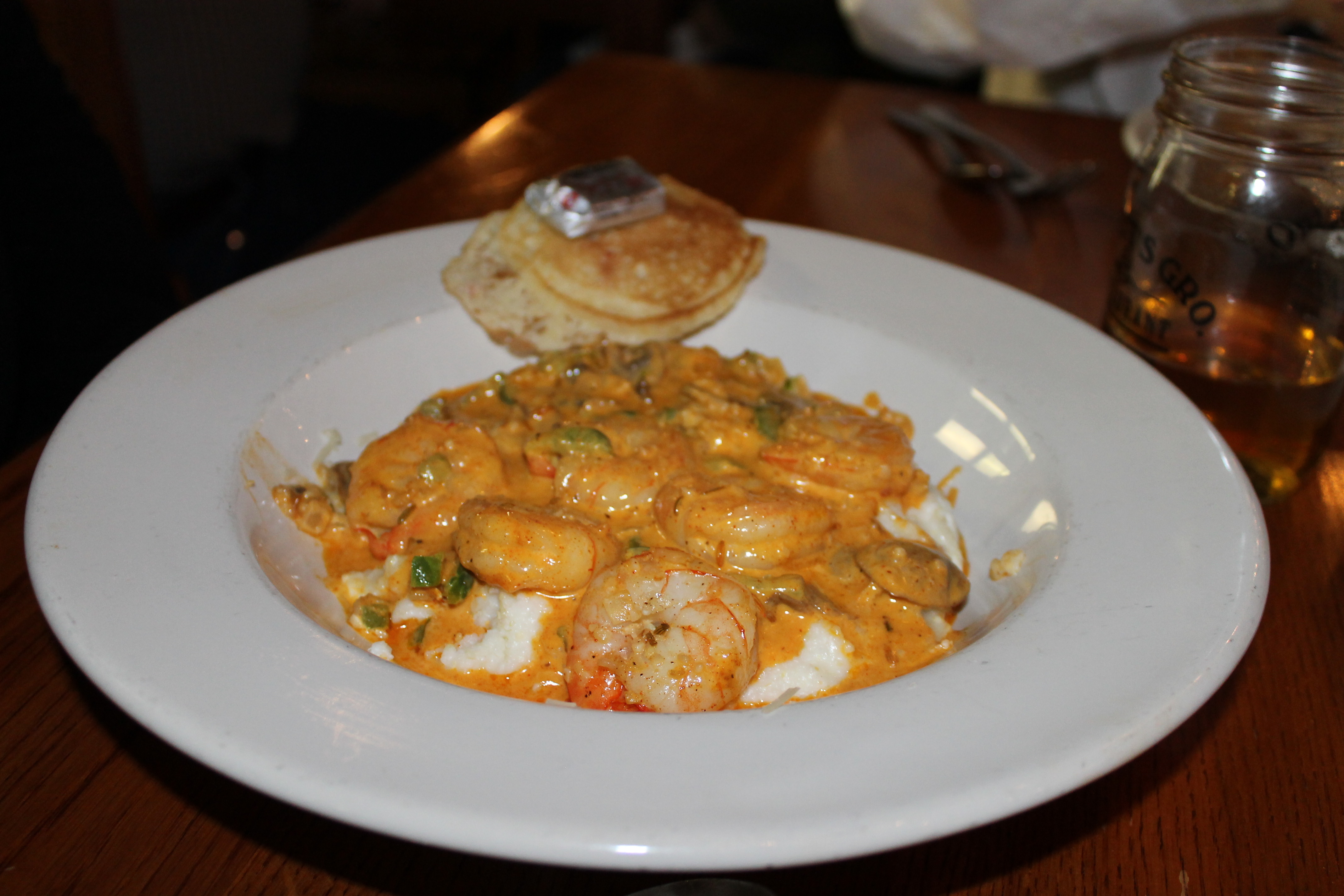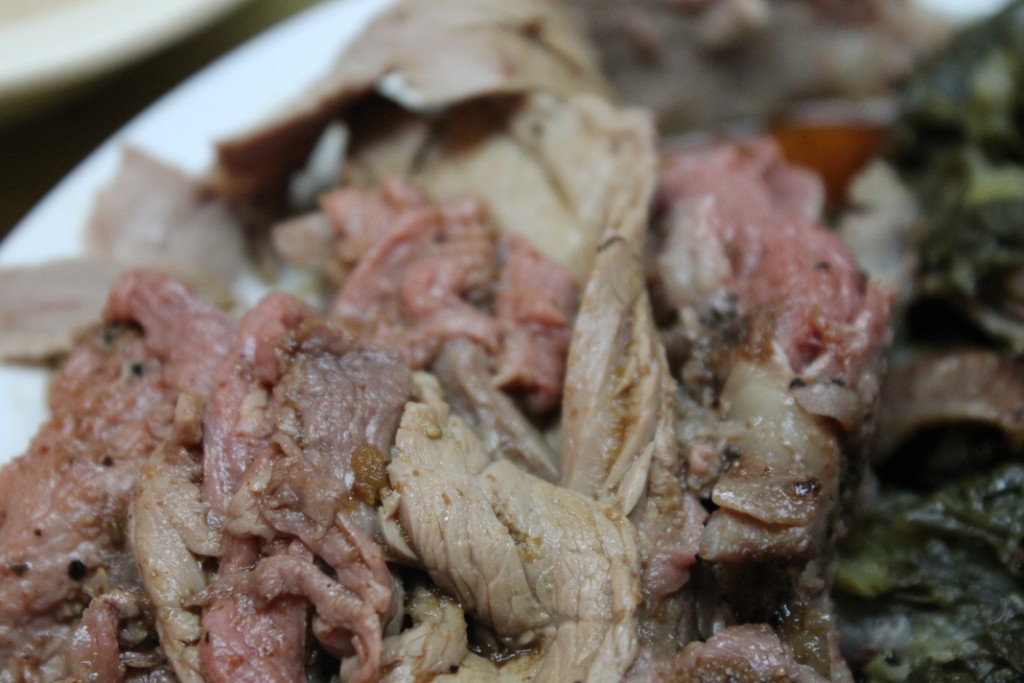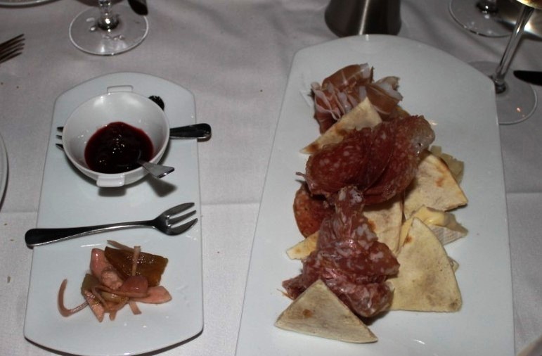 We ordered the antipasti selection for our appetizer – 3 different kinds of Italian cured meats, and 2 cheeses. They don’t specify which kinds on the menu, and I wasn’t taking notes, but one of the cheeses was a soft cheese with cow’s, goat’s, and sheep’s milk, and it was amazing. The hard cheese was also good, and the three cured meats were delicious. The side plate contains pickled vegetables, raspberry compote, and preserved figs, all of which combined well with the meat and cheese. The little triangles are pita bread.