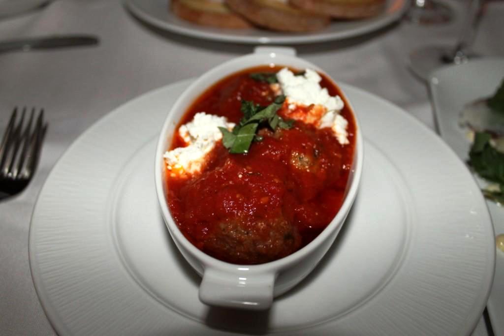 Hearth fired meatballs, in a house made tomato sauce with Bonnie Blue Chevre, fresh basil, and sambuca.