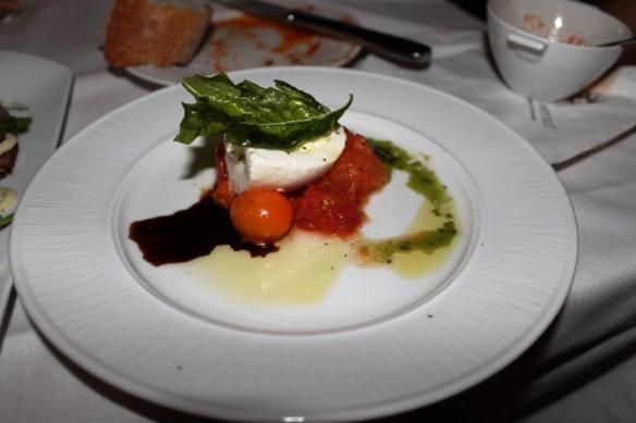 Caprese – mozzarella burrata, slow roasted jewel box tomatoes, and fried basil leaves are drizzled with pesto and a balsamic reduction. I prefer my caprese with all fresh tomatoes, not roasted, but this was still good.