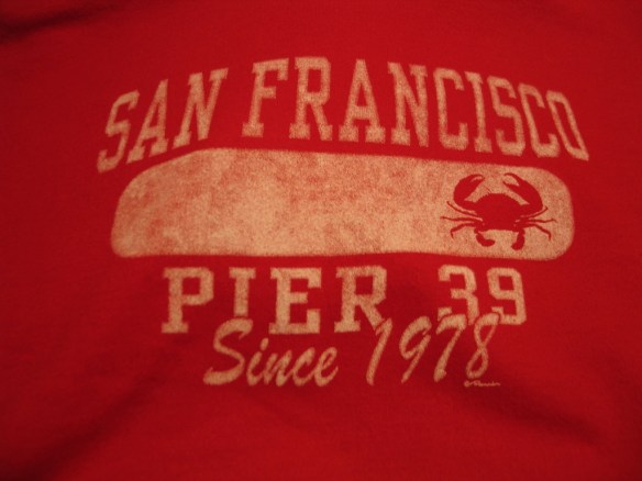 We all shared it, figuring that was a good way to do it without getting too full of crab. Kenny even tried a couple of little pieces, declaring that it was “Ok.” Of course you end up with crab under your fingernails, and then you think about all of those machines you touched at the Museum Mechanique, and how you are now eating with your hands…….but it was delicious nonetheless. Need to remember the packet of hand sanitizer wipes next time. There were plenty of little shops all along here but I had my magnet and my sweatshirt so I was quite happy with those as souvenirs.